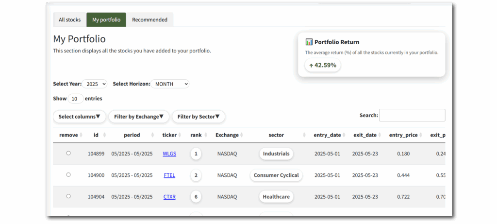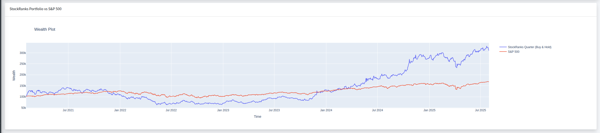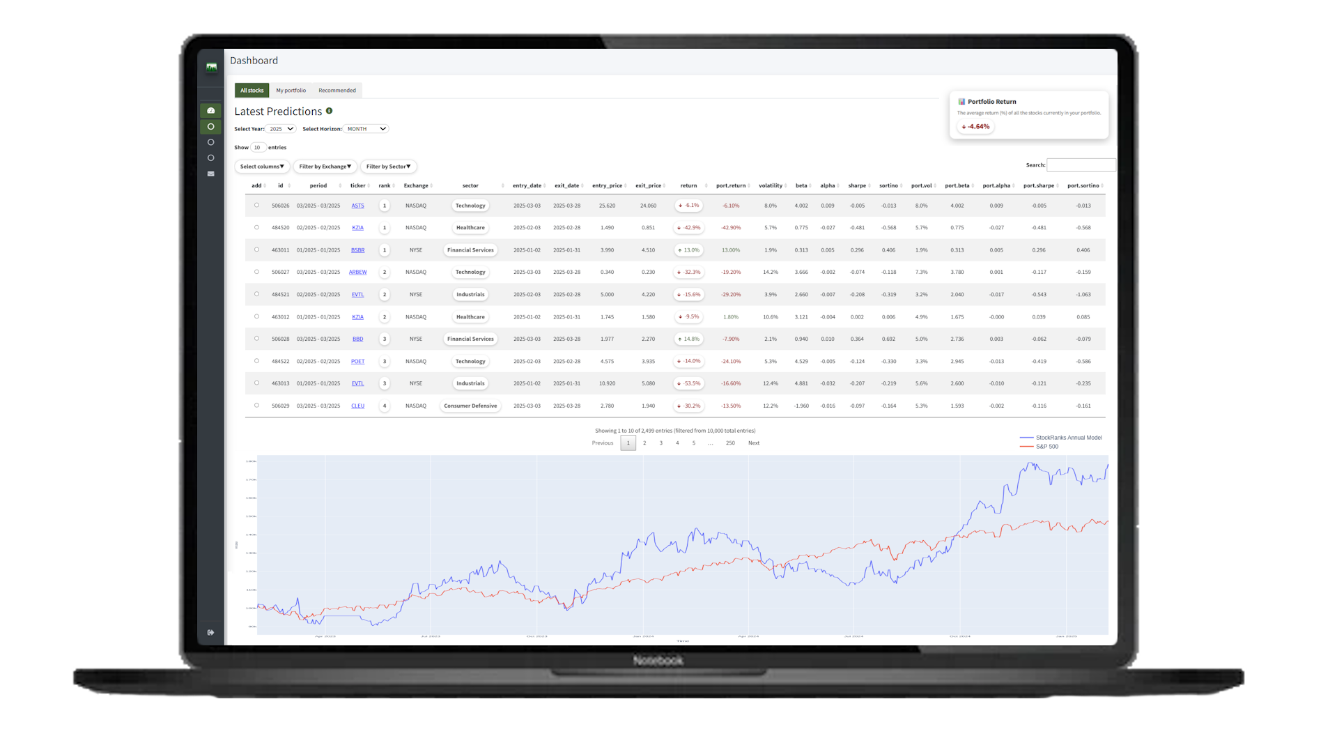 StockRanks offers users a ranking of the most promising stocks for the upcoming investing period, allowing for efficient sorting and filtering by industry. This enables the formation of profitable portfolios by focusing on top-ranked stocks. The tool is designed to detect investing opportunities by recognizing patterns in price behavior, company fundamentals, macroeconomic conditions, and technical price indicators.